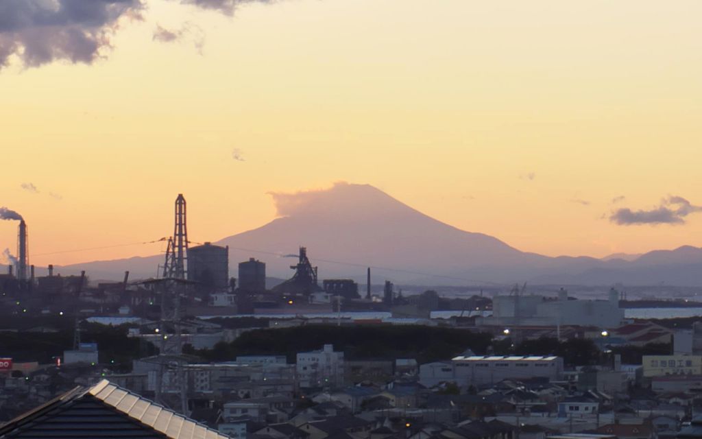 日没直後の富士山です。手前の工場群は新日鉄の施設の一部。